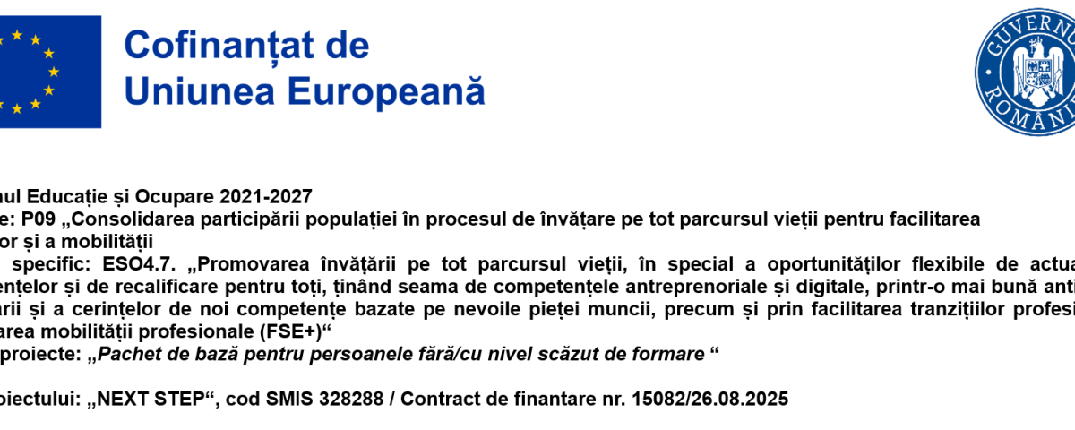 Cursul „Abilități și Tehnici Esențiale de Vânzări” face parte din proiectul NEXT STEP – Cod MySMIS 328288, în cadrul Programului Educație și Ocupare 2021 – 2027 și contribuie la sprijinirea tranzițiilor profesionale și creșterea mobilității pe piața muncii. Programul este destinat angajaților din Regiunea Sud-Muntenia și urmărește dezvoltarea competențelor esențiale necesare activităților moderne de vânzări.