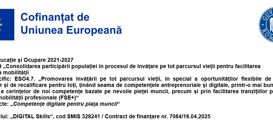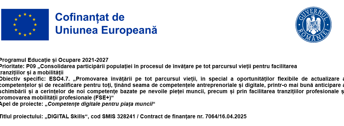 Cursul „Competențe digitale utilizate în servicii de asistență a clienților” face parte din proiectul Digital Skills – Cod MySMIS 328241, este derulat în cadrul Programului Educație și Ocupare 2021–2027 și cofinanțat de Uniunea Europeană. Programul se adresează angajaților din Regiunea Sud-Muntenia și are ca obiectiv dezvoltarea competențelor digitale și profesionale necesare în relația cu clienții în contextul actual al digitalizării.